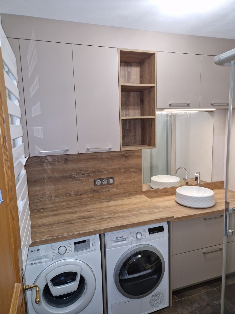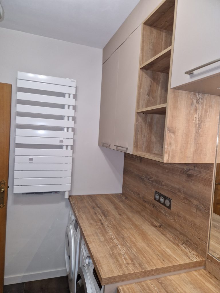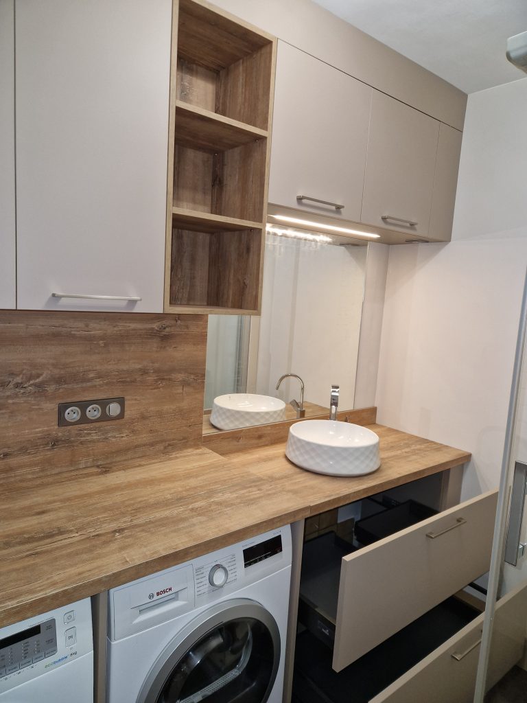 Les rangements ont été conçus sur mesure afin d’accueillir lave-linge et sèche-linge de manière discrète, tout en offrant de généreux espaces de stockage. Les niches ouvertes en bois viennent rythmer l’ensemble et apportent une touche décorative subtile, contrastant avec les lignes épurées du mobilier.